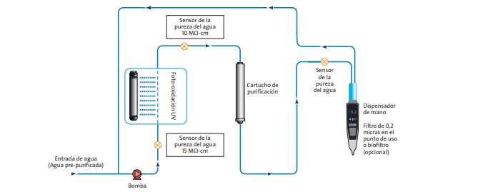 De la misma manera, el carbono orgánico total (COT) es un indicador universal útil de la presencia de impurezas orgánicas en el agua. Vigilando el COT en línea y en tiempo real, podemos asegurar la pureza orgánica global del agua. La pureza global, iónica y orgánica, del agua se puede confirmar